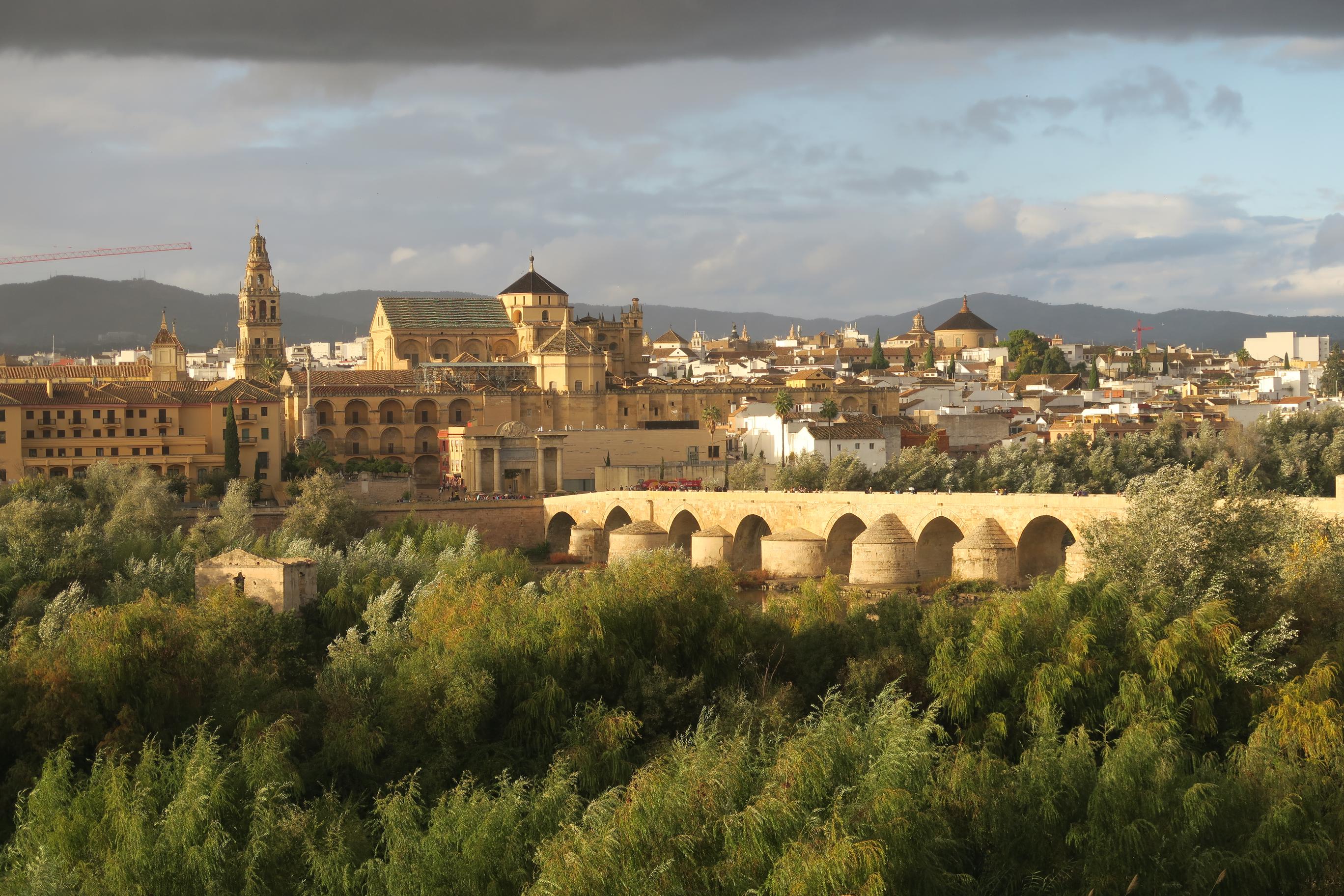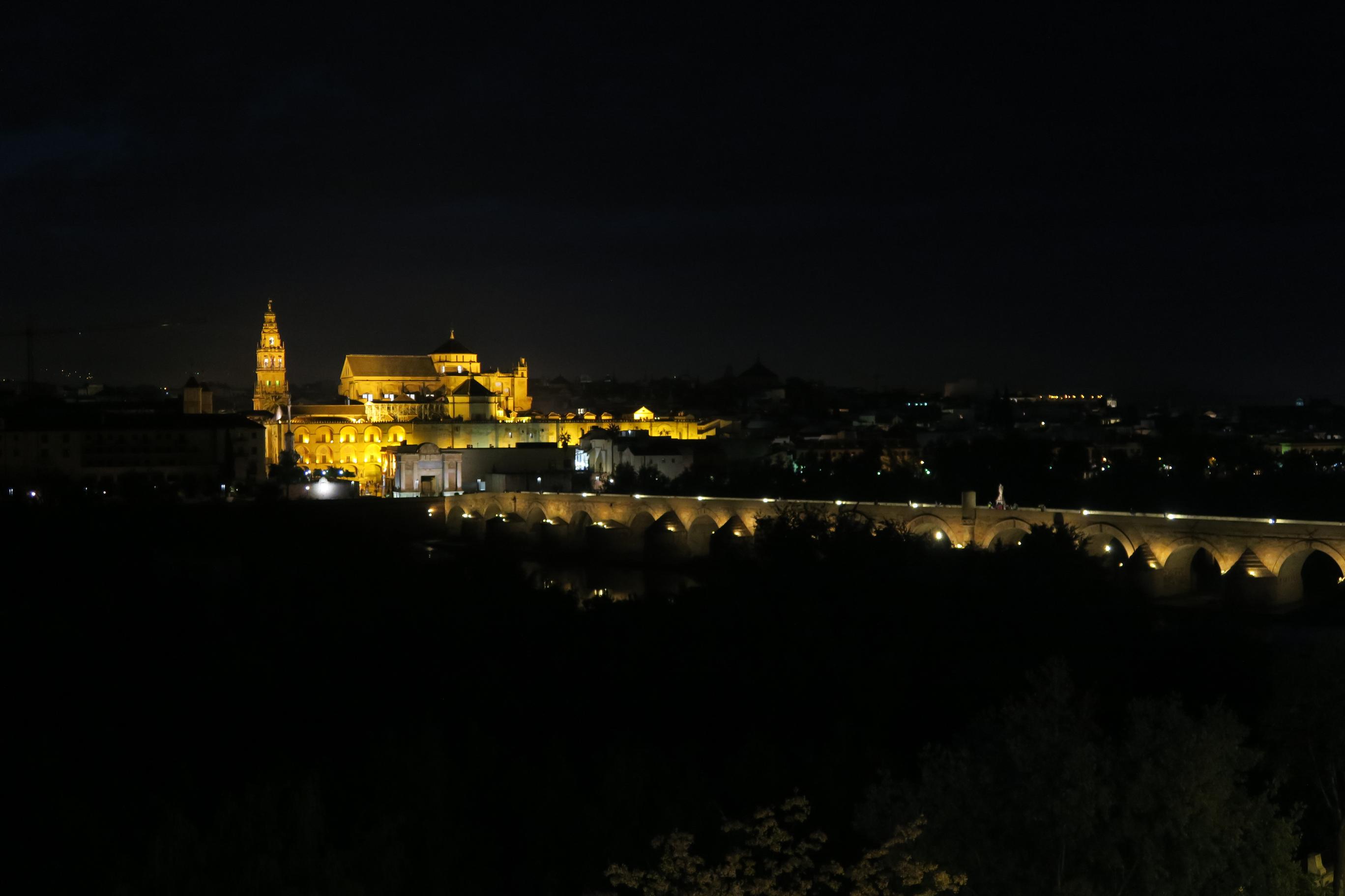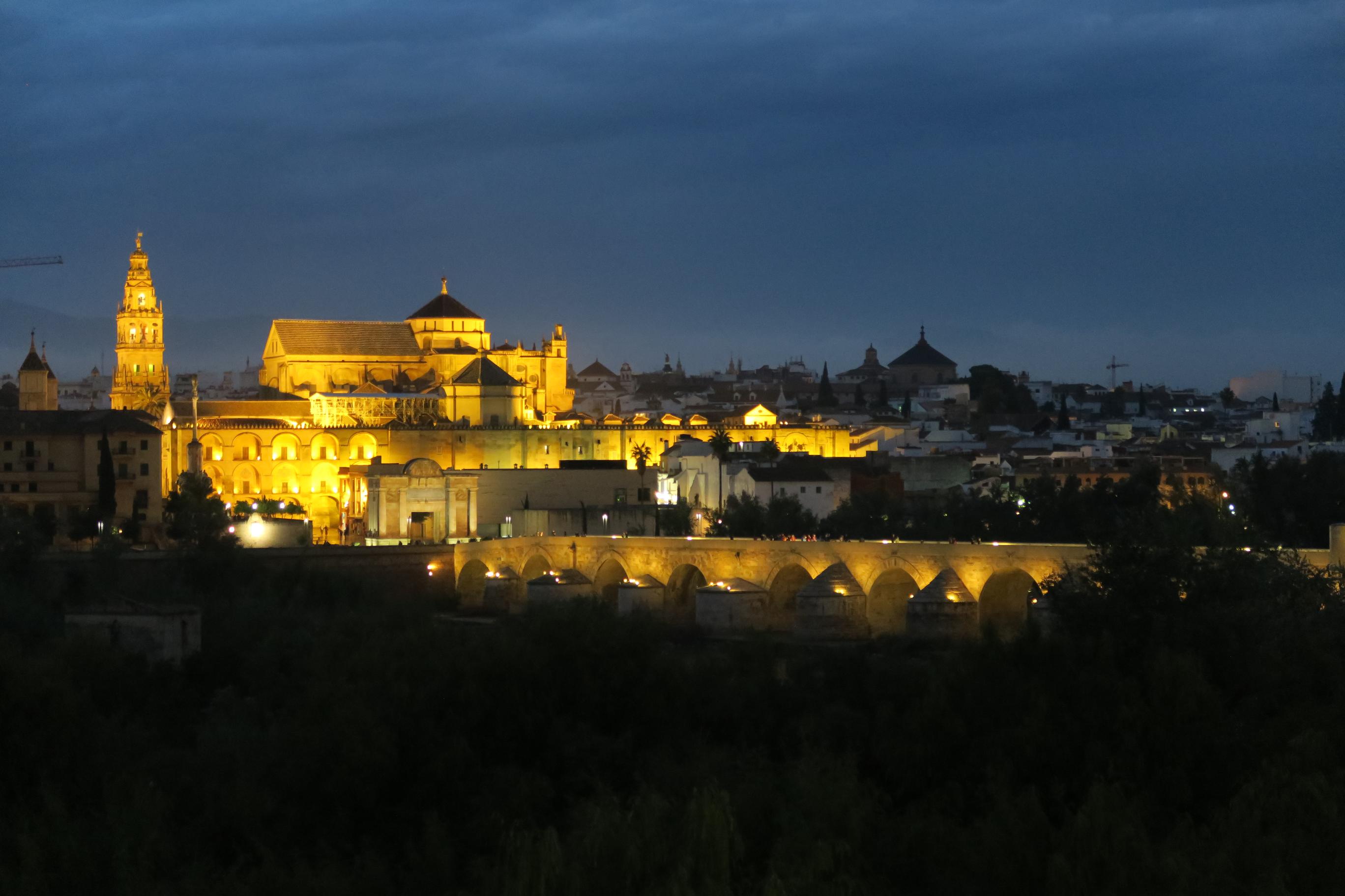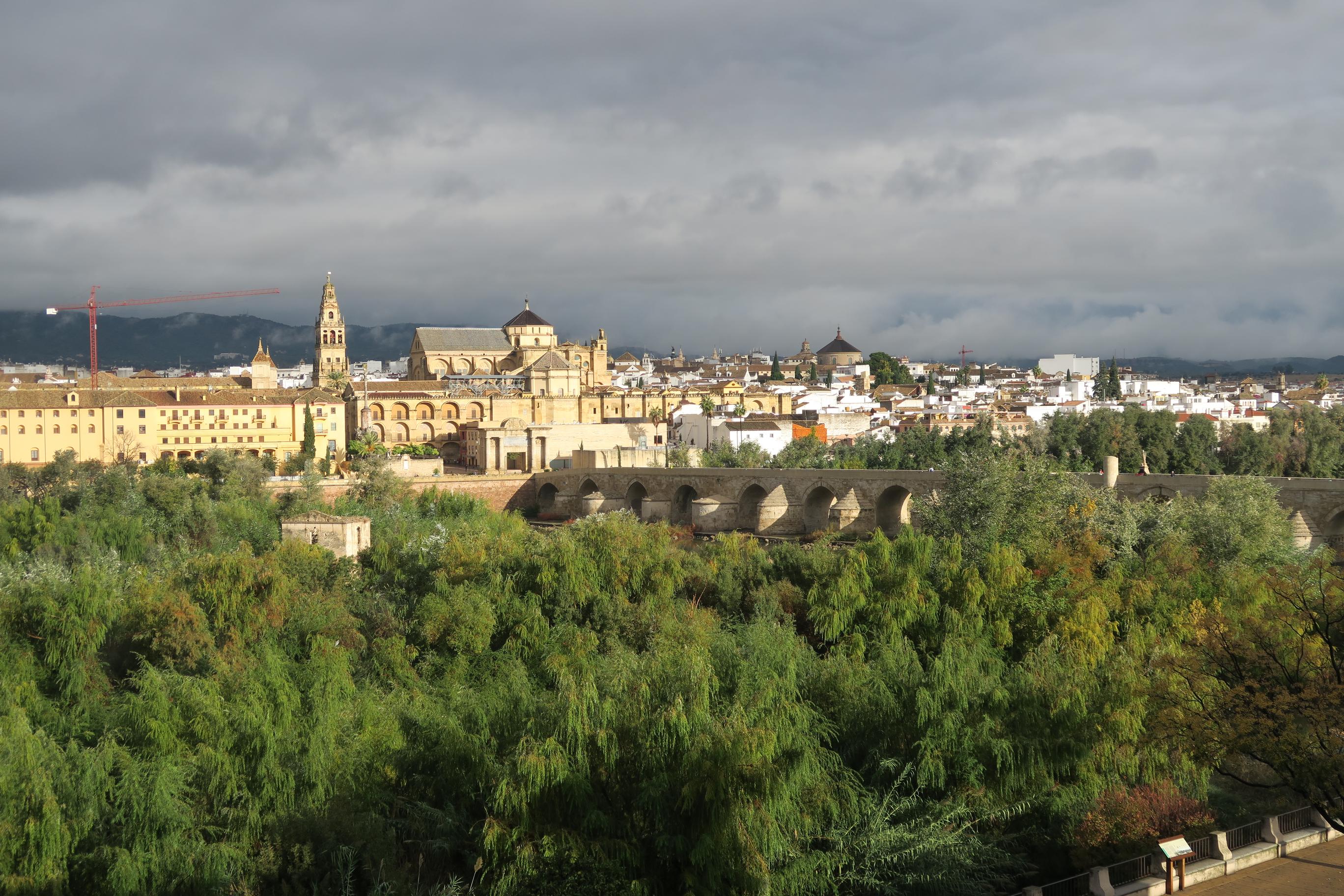 Auf der Fahrt nach Cordoba löste sich eine Abdeckung über dem linken Vorderrad und schleifte (auf der Autobahn!) kilometerlang auf der Straße, bis wir zur nächsten Ausfahrt kamen und die kaputte Abdeckung entfernten. Es lohnt sich halt doch, wenn man ein Taschenmesser dabei hat…. 🙂 Zwischendrin gings dann noch durch einen Wolkenbruch, aber wir kamen wohlbehalten in Cordoba an. Nur das Hotel fanden wir nicht…. Sind 3x dran vorbeigefahren, da der Name „vor Ort“, am Hotel angebracht,… ein ganz anderer ist, als es im Internet heisst. Aber auch das konnten wir klären und unser Zimmer mit fantastischem Blick auf die Altstadt beziehen. Nach kurzer Auspackpause gings dann noch auf einen kleinen Bummel in die Altstadt.
